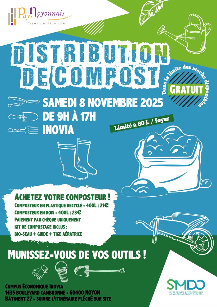 La Ville de Noyon vous invite à une grande distribution de compost gratuit le samedi 8 novembre 2025 de 9h à 17h, au Campus Économique Inovia (1435 boulevard Cambronne – Bâtiment 27, suivre l’itinéraire fléché sur site).